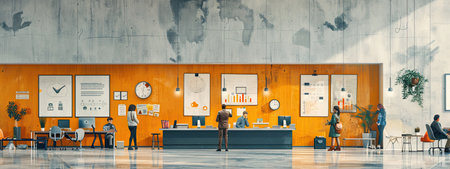 Experience a sleek corporate reception area blending modern design with a welcoming atmosphere.