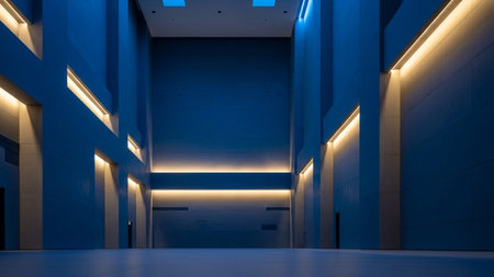 A minimalist modern interior with deep blue walls, featuring geometric lines and warm uplighting that creates...