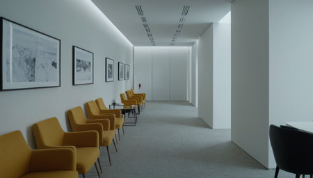 Public seating in city terminal with minimalist lighting and architectural textures dominating the scene