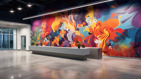 A sleek bright and shining office with a mix of modern art and colorful murals created with Generative AI
