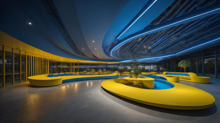 Interior of a modern building at night with yellow and blue lights. ai generated