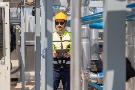 Two Professional engineer man and women working checking and maintenance pipeline construction top of the building. Worker in safety uniform using tablet at pipeline construction system