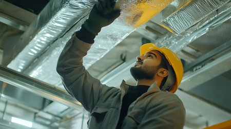 A worker wearing protective gear examines pipes in a dimly lit industrial area, showing his expertise and focus.