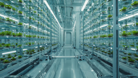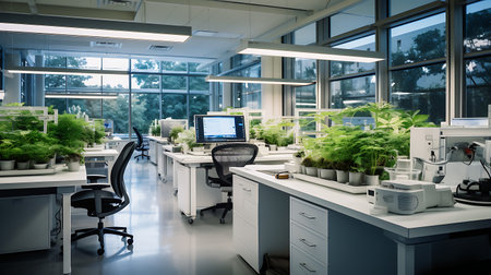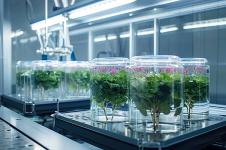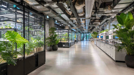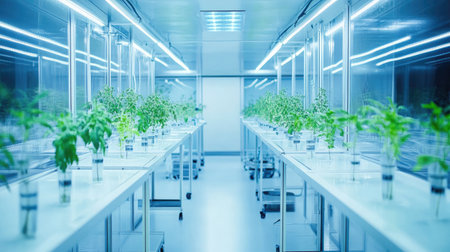 Innovative biotech lab showcases green plants thriving under LED lights, promoting sustainable scientific practices in a modern setting.