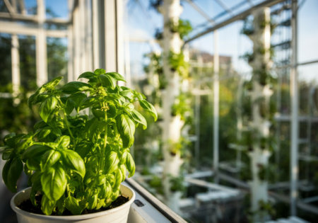 Potted basil plant in sunlit greenhouse with vertical hydroponics system.