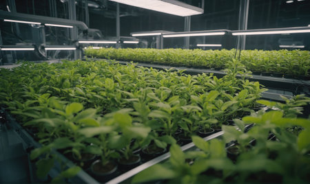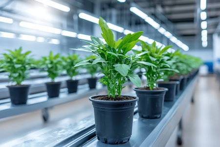 A collection of green potted plants thriving in a modern indoor farm showcasing advanced lighting and clean, efficient cultivation practices for sustainable agriculture.