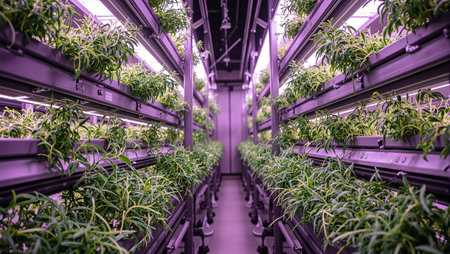 Innovative vertical farm with aromatic herbs under purple and white grow lights