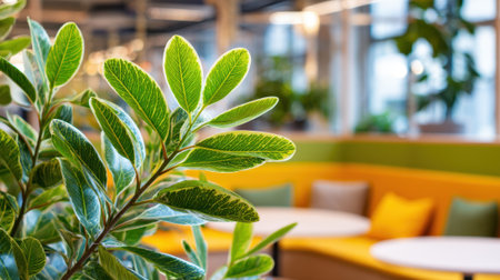 Closeup on a vibrant indoor plant with detailed leaves in focus while the surrounding cozy seating and interactive workspace remain tastefully out of focus.