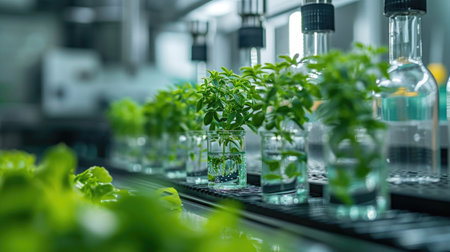 Hydroponic plants in a scientific lab greenhouse, surrounded by test tubes and cutting-edge equipment for genetic engineering experiments.