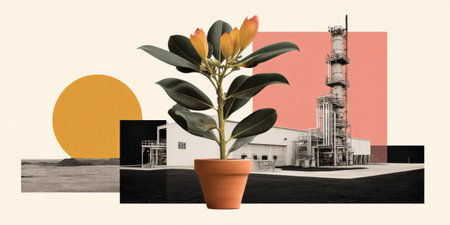 Collage environment potted plant industrial building abstract composition warm tones peaceful balance modern still life