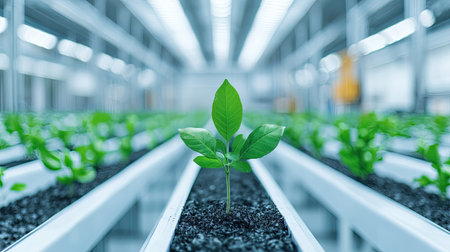 A vibrant green plant stands out in a modern greenhouse, showcasing advanced agricultural practices and sustainable growth techniques.