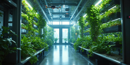 A high-tech urban farming system where AI-controlled drones tend to crops, monitor soil health, and optimize water usage. The farming