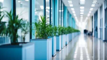 Lush green plants line a modern office space filled with natural light during the daytime