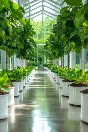 Green plants line a bright corridor in a modern greenhouse. Sunlight streams in through glass walls creating a vibrant environment for plant growth.