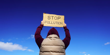stop pollution. An inscription on a cardboard sign in the hands of an environmental activist against a clear blue sky.