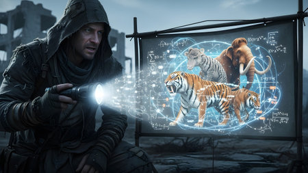 A man in a hooded cloak shines a flashlight, projecting holographic animals and mathematical...