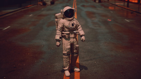 An astronaut in a white suit stands in the middle of a deserted street. Dim streetlights cast an orange glow on the wet pavement as the sky darkens above.