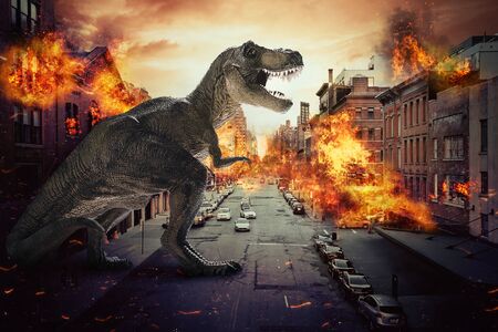 scene of the giant dinosaur destroy the city