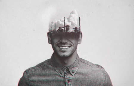 Dont allow anyone to pollute your mind. Multiple exposure shot of a refinery superimposed over a young mans head.