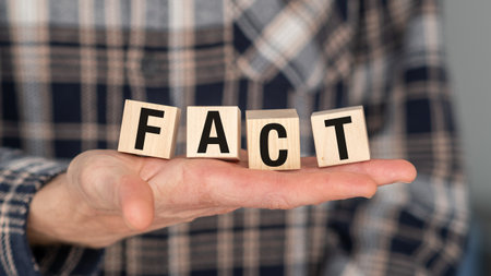 A person is holding a wooden block with the letters FACT on it. The letters are arranged in a way that they spell out the word FACT.