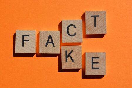 Fact and Fake, words in 3d wooden alphabet letters on orange coloured background