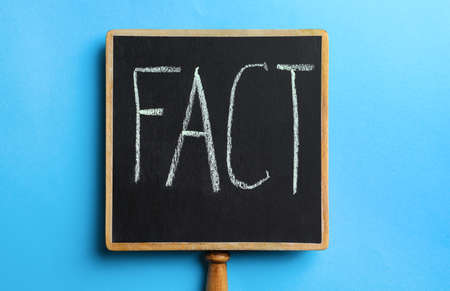 Small chalkboard with word FACT on light blue background, top view