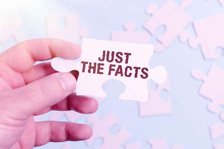 Text caption presenting Just The Facts. Business overview to have the correct information about the exact details Building An Unfinished White Jigsaw Pattern Puzzle With Missing Last Piece