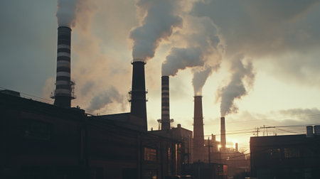 industrial landscape with smokestacks and factories emitting carbon emissions, representing the negative impact of climate change on air quality. Generative AI illustrator