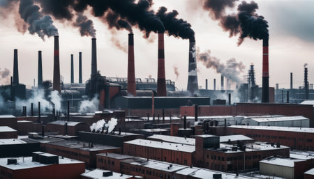 Overlooking a sprawling industrial district, thick plumes of dark smoke rise from numerous smokestacks, dominating the cityscape under a cloudy sky.. AI Generation