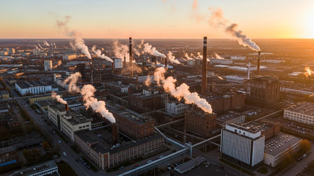 Chimneys release thick smoke into the evening sky, creating a striking contrast against the sunset. The industrial landscape highlights pollution.