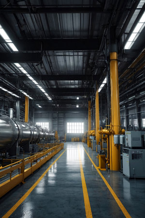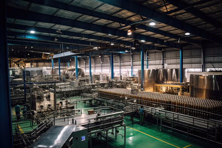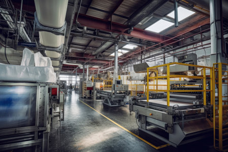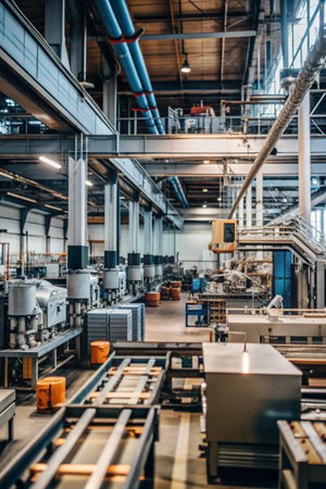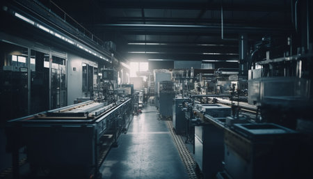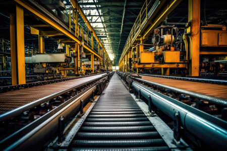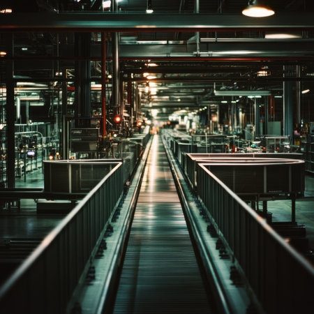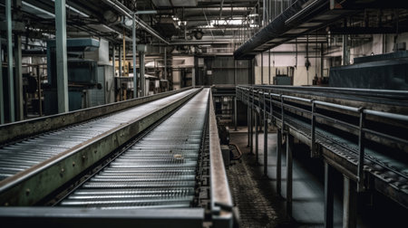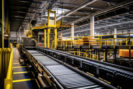 A captivating view of a modern industrial warehouse showcasing machinery and a conveyor belt, emphasizing technology and efficiency in production.