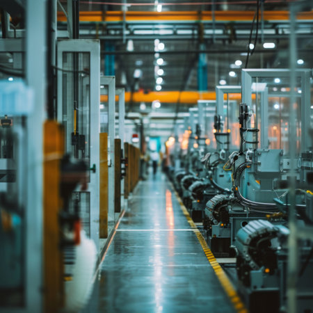 A long, organized assembly line stretches through a modern factory, showing automated machinery, conveyor belts, and workers engaged in production.