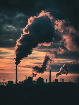 Smoke stacks emitting dark, heavy smoke into the atmosphere, polluting the environment at sunset