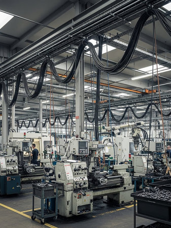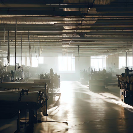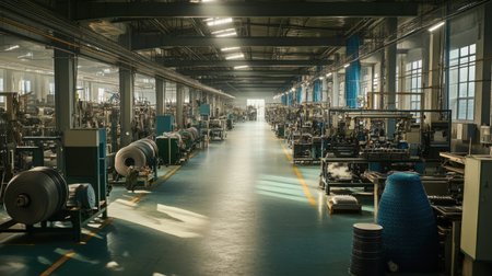A spacious industrial manufacturing facility filled with various machines and equipment. Natural light streams through tall windows, illuminating the organized work environment.
