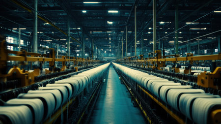 This image captures the expansive interior of a textile factory, showcasing an organized production line filled with machinery and equipment used in fabric manufacturing.