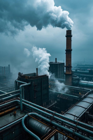 Industrial plant with complex machines and chimneys and smoke. Global air pollution