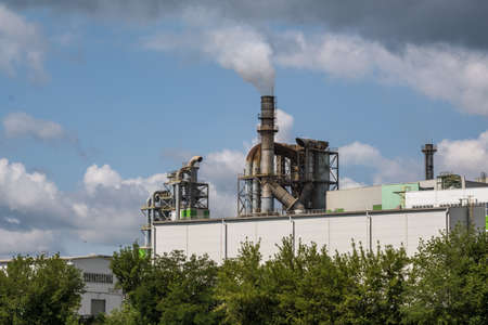 pipes of woodworking enterprise plant sawmill near river. Air pollution concept. Industrial landscape environmental pollution waste of thermal power plant