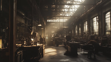 A vibrant and atmospheric industrial workshop bathed in sunlight showcases artisans engaged in crafting. The space is filled with diverse equipment and tools.