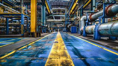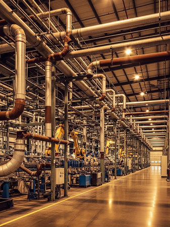 An expansive factory interior filled with complex piping systems, robotic arms, and various machinery, showcasing industrial automation and manufacturing.