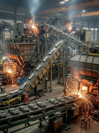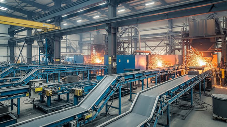 An interior view of a busy industrial factory. Multiple conveyor belts stretch across the frame, with sparks flying from machinery in the background. The scene depicts a dynamic manufacturing environment with heavy equipment and a sense of ongoing production.