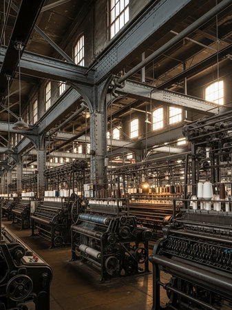 Interior of an old textile mill featuring rows of vintage spinning machines, industrial metal beams, and natural light streaming through large windows.