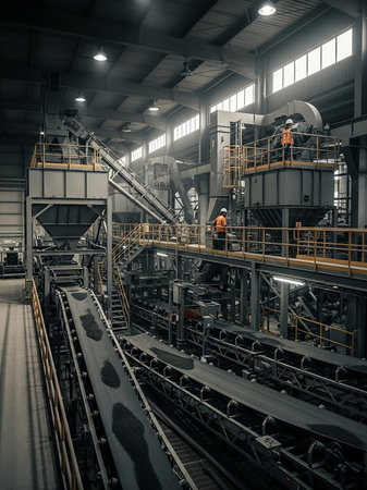 Interior view of a large industrial factory with multiple conveyor belts carrying materials and workers in safety gear on elevated platforms.
