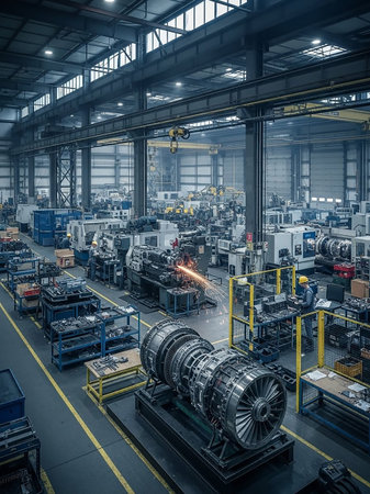 A wide-angle view inside a large industrial factory showcasing numerous machines, a jet engine, and a worker.