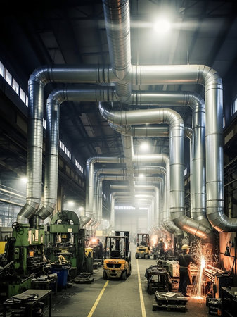A busy factory floor with forklifts, workers, sparks from welding, and large metal pipes overhead.