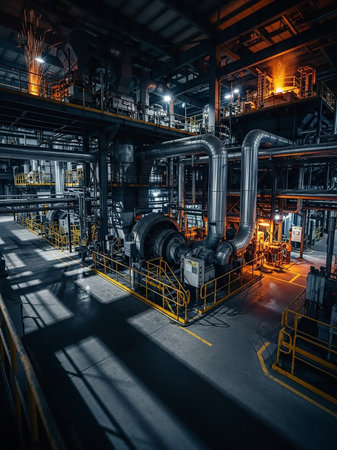The interior of a large industrial plant with extensive piping, heavy machinery, and glowing sparks emanating from a production area, creating a dramatic atmosphere.