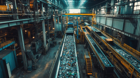 Conveyors filled with mixed materials traverse an industrial space where waste is sorted and processed. Workers efficiently manage recycling operations within the facility.