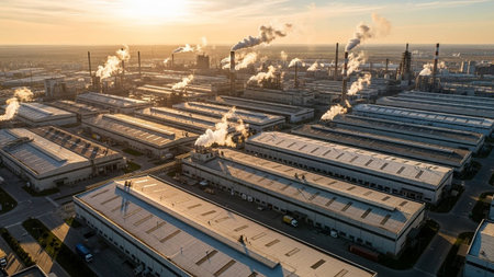 Sunset over a vast industrial complex, with silhouettes of factories, warehouses, and cooling towers against a dramatic sky, AI Generated