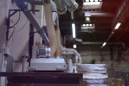 Manufacture of wood pellets. Close-up photo of equipment. Woodworking timber industry: machines and equipment for pressing and cutting sawn timber.