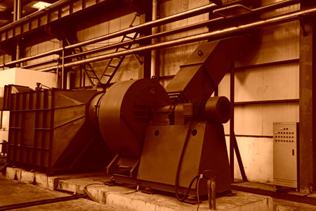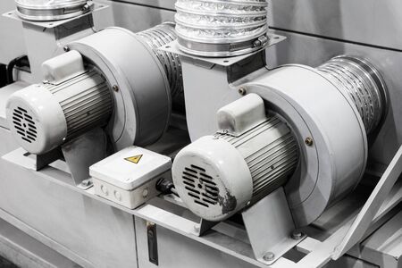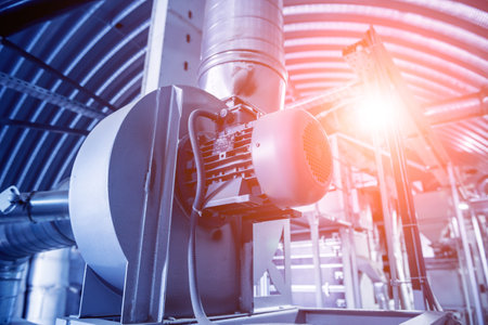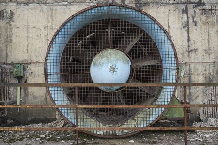 Close-up of big industrial fan in a factory. Ventilation of plant building. Backlit, sun light, rays of light.