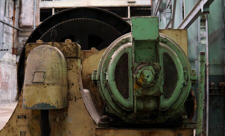 Grain Image: Close up of old machine factory made of steel and used in the past. Broken and rustic machine left over in abandon factory. Image of aged equipment with rust and gear part.
